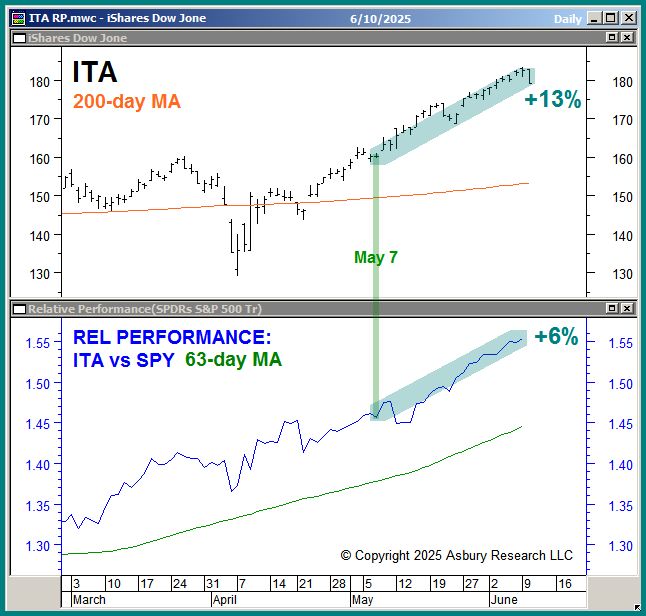 We exited our May 7th long/overweight idea in the iShares U.S. Aerospace & Defense ETF (ITA) this morning for a 13.0% outright gain while outperforming the S&P 500 (SPY) by 6%.