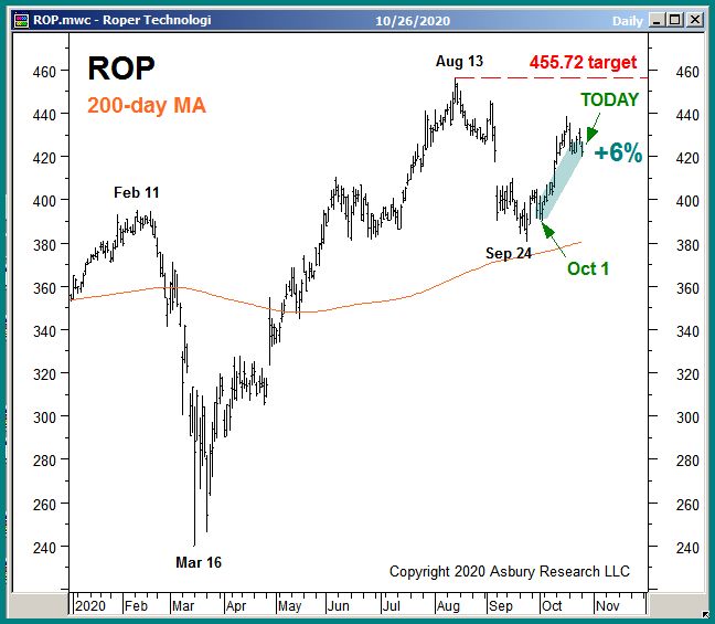 Chart 1 below shows that we were stopped out of our Oct 1st long idea in Roper Technologies (ROP) this morning for a 6% profit as our 424.02 stop was elected shortly after the open.