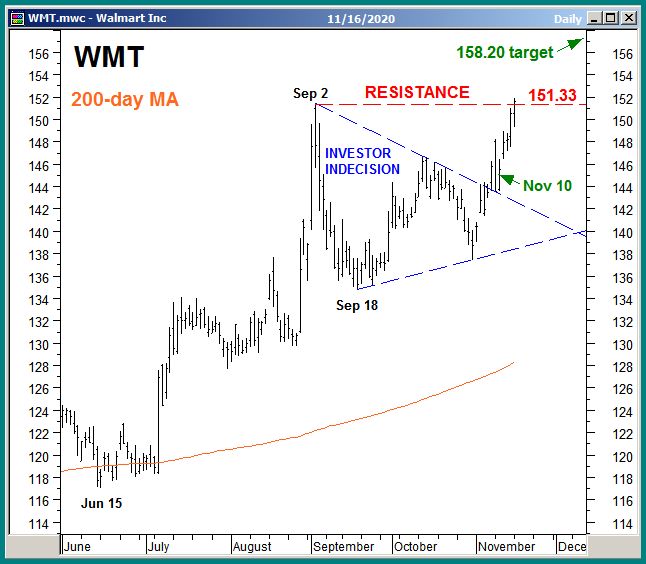 Chart 1 below plots Consumer Staples bellwether Walmart (WMT) daily since June, showing that it is currently testing formidable overhead resistance at $151.33, its Sep 2nd all-time high.