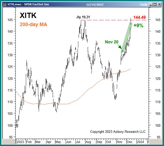 We exited our November 20th long idea in the SPDR FactSet Innovative Technology ETF (XITK) today for a 9% outright gain while outperforming the benchmark S&P 500 (SPX) by 5%.