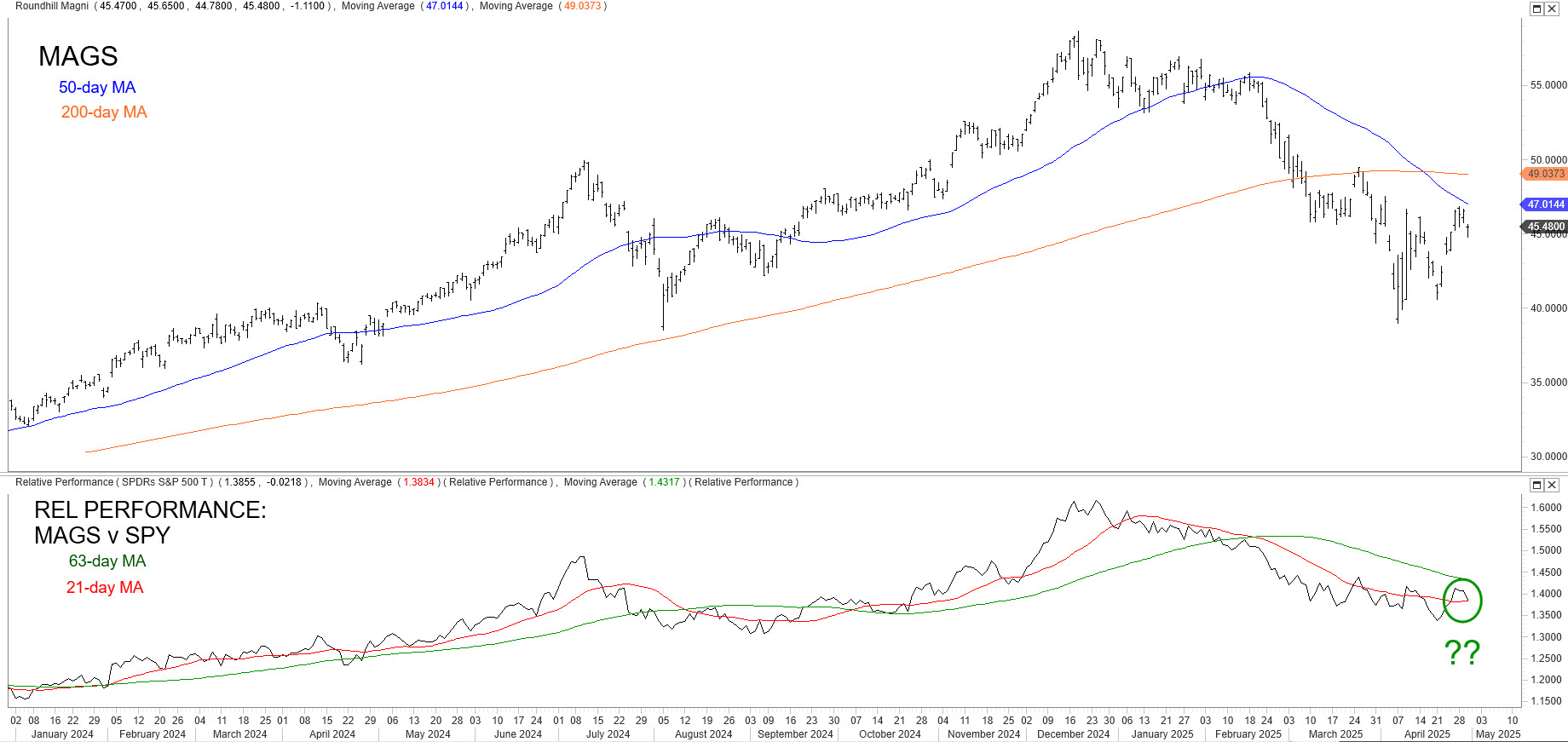 The Roundhill Magnificent Seven ETF (MAGS) is currently outperforming the S&P 500 Trust ETF (SPY) on a Tactical (monthly) basis as of April 25th, but its Feb 7th trend of Strategic (quarterly) relative underperformance versus SPY is still intact. Considering that the “MAG 7” has been a coincident if not leading indicator of US broad market for at least the past year, how MAGS performs relative to SPY in the weeks ahead will be seen as a coincident if not leading indication of Q2 2025 US broad market direction.