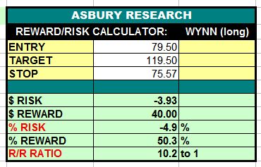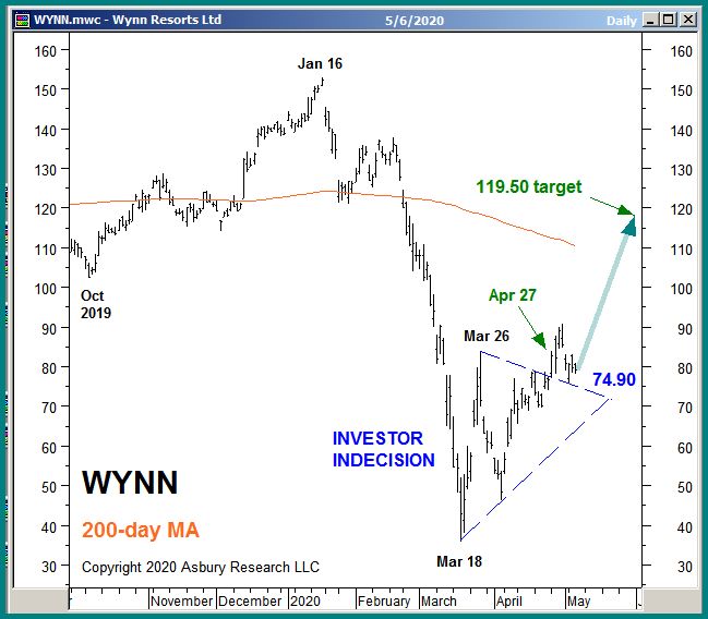Wynn Resorts, Limited (WYNN) is in the midst of a late April breakout higher from 5 weeks of sideways investor indecision at the recent lows. A sustained rise above the $74.90 area would confirm the validity of the breakout and target an eventual, additional 50% rise to $119.50 per share. This is an Asbury Momentum idea.