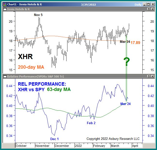The upper panel of Chart 1 below plots XHR daily since October 2021 along with its 200-day moving average, a widely-watched major trend proxy. The lower panel plots the daily relative performance of XHR versus the SPDR S&P 500 ETF (SPY) along with its 63-day (quarterly) moving average, the latter which identifies the Strategic trend of relative performance.